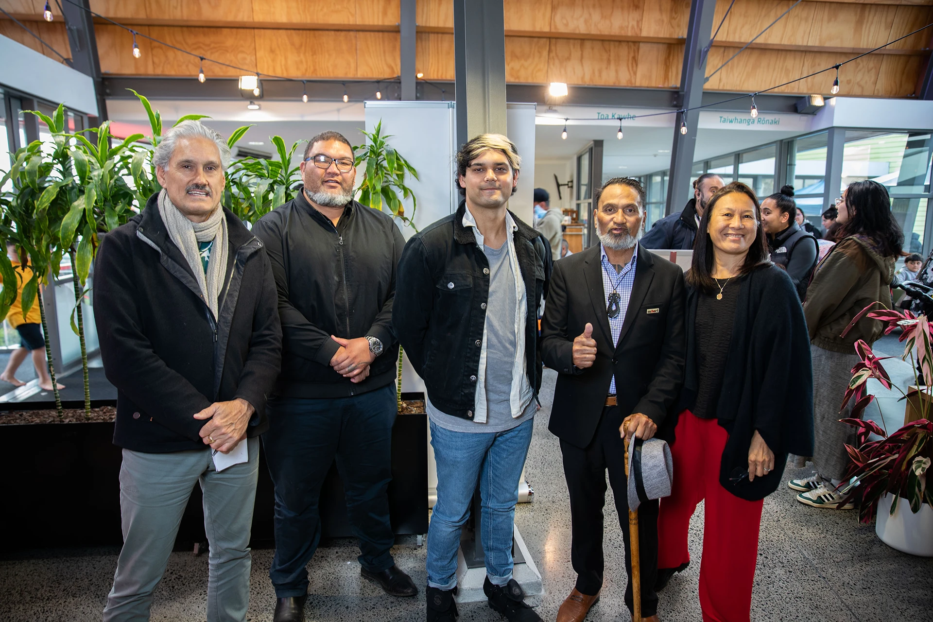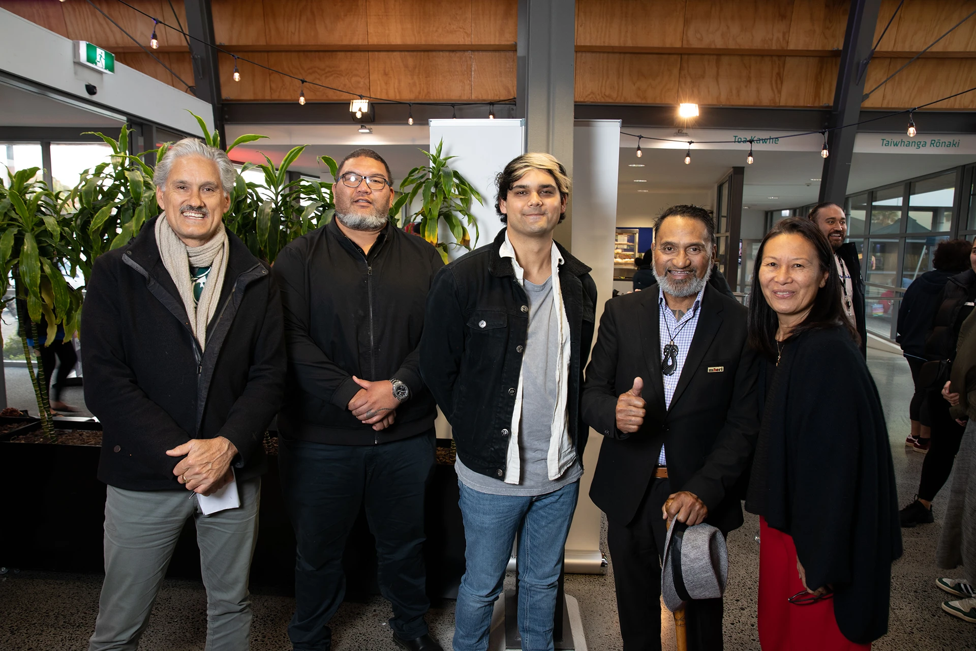 MOKO Launch at Te Noho Kotahitanga Marae, Unitec Mt Albert, Auckland, March 2020. Each of the five marae representatives are holding copies of the Memorandum of Understanding signed in partnership with the Research Centre.